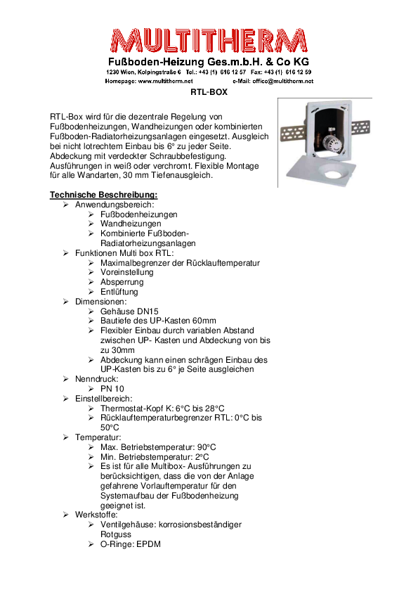Die RTL‐Box wird für die dezentrale Regelung von Fußbodenheizungen, Wandheizungen oder kombinierten Fußboden‐Radiatorheizungsanlagen eingesetzt. Sie kann einen Ausgleich bei nicht lotrechtem Einbau von bis 6° zu jeder Seite ausgleichen. Sie verfügt über eine Abdeckung mit verdeckter Schraubbefestigung. Unsere Multi-Box ist in weiß oder verchromt erhältlich.