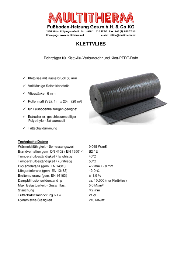 Das Multitherm Klett Vlies ist ein extrudierter, geschlossenzelliger Polyethylen-Schaumstoff für die Multitherm Klett Rohre. Es besteht aus einer vollflächigen Selbstklebefolie mit starker Haftung und mit einem 50mm Rasterdruck. Trotz geringer Aufbauhöhe von 6mm hat das Klett Vlies eine Trittschallverbesserung von 21dB.
