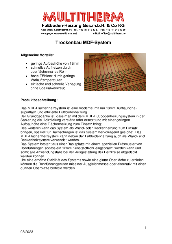Das MDF (Mitteldichtefaserplatte)-Flächenheizsystem ist eine moderne, mit nur 18mm Aufbauhöhe superflache und effiziente Fußbodenheizung auf Basis einer Holzfaserplatte. Der Grundgedanke ist, dass man mit dem MDF-Fußbodenheizungssystem in der Sanierung die Holzdielung verstärkt oder ersetzt und mit einer geringen Aufbauhöhe eine Flächenheizung zum Einsatz bringt. Weiters kann das System als Wand- oder Deckenheizung zum Einsatz kommen, speziell für Dachschrägen ist das System hervorragend geeignet. Das MDF-Flächenheizsystem kann neben der Fußbodenheizung auch als Wand- und Deckenheizsystem verwendet werden. Das System besteht aus einer Basisplatte mit einem speziellen Fräsmuster von Rohrführungen sodass ein 12mm Kunststoffrohr eingebracht werden kann und somit alle Anwendungsfälle bei der Ausgestaltung der Heizkreise abgedeckt werden können. Um eine erhöhte Stabilität des Systems sowie eine glatte Oberfläche zu erzielen können die Rohrführungsnuten mit einer Ausgleichmasse oder alternativ mit einer dünnen Oberplatte bedeckt werden