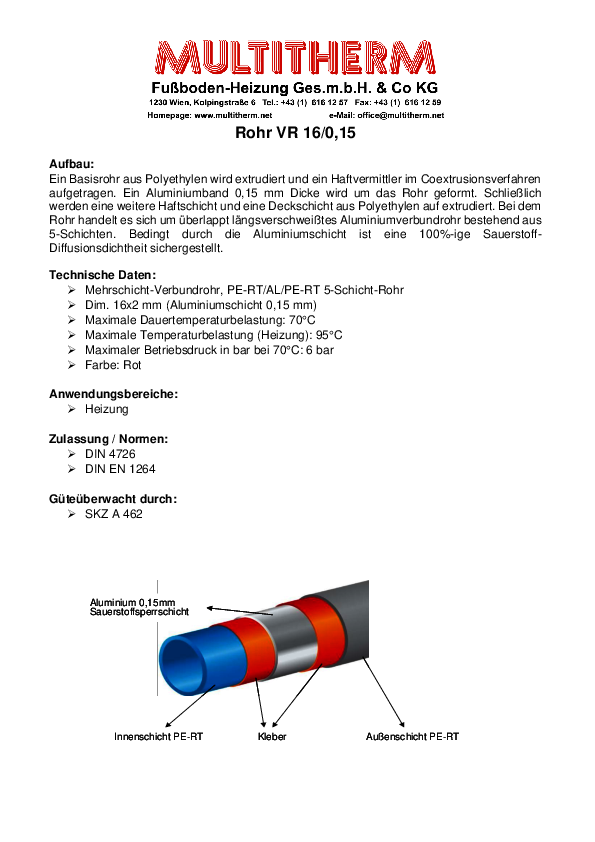 Das Mehrschichtverbundrohr kombiniert die Vorteile eines Kunststoffrohres mit jenem eines Aluminiumrohres. Dieses Rohr weist folgende Vorteile auf: