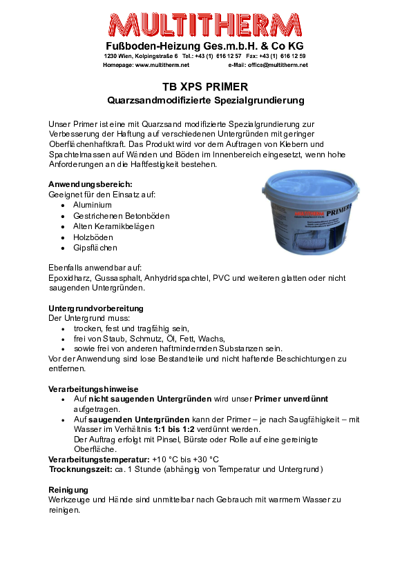 Diese Bodengrundierung eignet sich besonders für unsere TBXPS Platten um die Haftung von Fliesenkleber oder Kitt auf den Platten zu gewährleisten. Verbrauch: unverdünnt 250-300 g/m² Trocknungszeit: 1 Stunde