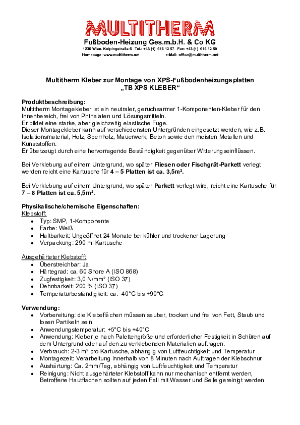 Multitherm Montagekleber ist ein neutraler, geruchsarmer 1-Komponenten-Kleber für den Innenbereich, frei von Phthalaten und Lösungsmitteln. Er bildet eine starke, aber gleichzeitig elastische Fuge.