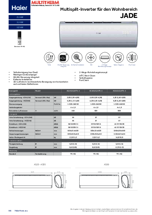 Das high-end Modell Jade verfügt über ein elegantes Innengerät mit einem weißen Design-Paneel und einem weißen LCD-Display. Der integrierte Eco-Sensor hilft dazu einen 3D-Luftstrom zu erzeugen, welcher auf den Benutzer gerichtet werden kann, oder von diesem abgewandt wird. Bei diesem high-end Gerät ist ein IFD-Luftfiltersystem verbaut. Weiters führt dieses Modell eine Selbstreinigung durch. Die Selbstreinigungsfunktion friert die Verdampferoberfläche mit der in der Luft vorhandenen Feuchtigkeit ein und entfernt den Schmutz während des Abtauens. Dieser Schmutz begünstigt das Wachstum von Bakterien und beeinträchtigt die Qualität der Luft.