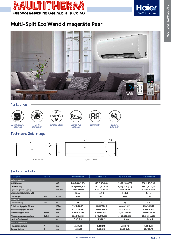 Das Modell Perl verfügt über ein kompaktes weißes Innengerät mit einem LCD-Display und dem Coanda Plus Luftstrom. Beim Coanda Plus Luftstrom, wird die bewegte Luft auf eine intuitive Weise an den Raum abgegeben, dadurch bildet sich eine gleichförmige Luftzirkulation im Raum. Weiters verfügt das Klimagerät über eine UVC-Sterilisation und eine 56°C Steri-Clean Funktion. Bei dieser werden Bakterien und Viren abgetötet, indem der Verdampfer 30 Minuten lang auf 56°C erhitzt wird. Nach neuesten Forschungsergebnissen können fast keine Bakterien und Viren 30 Minuten lang bei 56°C überleben. Sobald der Erhitzungsprozess abgeschlossen ist, wird der Verdampfer sofort abgekühlt, um eine bessere Sterilisationsleistung zu erzielen.