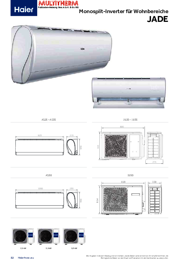 Bei dem high-end Modell Jade handelt es sich um ein Klimagerät welches bis zu Energieklasse A+++ beim Kühlen und A++ beim Heizen arbeitet. Es verfügt über ein elegantes Innengerät mit einem weißen Design-Paneel und einem weißen LCD-Display. Der integrierte Eco-Sensor hilft dazu einen 3D-Luftstrom zu erzeugen, welcher auf den Benutzer gerichtet werden kann, oder von diesem abgewandt wird. Bei diesem high-end Gerät ist ein IFD-Luftfiltersystem verbaut. Weiters führt dieses Modell eine Selbstreinigung durch. Die Selbstreinigungsfunktion friert die Verdampferoberfläche mit der in der Luft vorhandenen Feuchtigkeit ein und entfernt den Schmutz während des Abtauens. Dieser Schmutz begünstigt das Wachstum von Bakterien und beeinträchtigt die Qualität der Luft.