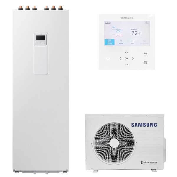 Die Wärmepumpe Samsung ClimateHub All in One ist eine SPLIT-Wärmepumpe für Heizen & Kühlen. Sie verfügt über einen integrierten Speicher mit einem Fassungsvolumen von 200 oder 260 Liter mit verstellbaren Füßen und Legionellenschaltung. Sie eignet sich speziell für Neubauten, da sie kompakt und platzsparend in der Aufstellung ist. Bei dieser höchst energieeffizienten Wärmepumpe kann bis zu einem Betriebsbereich bis -25°C Außentemperatur gearbeitet werden. Die Vorlauftemperatur kann bis zu 65°C betragen. Der Leistungsbereich dieser Luft/Wasser Wärmepumpe ist 4, 6, 9 kW. Diese Wärmepumpe bietet eine Konnektivität mit SmartThings Wi-Fi, Sprachsteuerung und Home loT.