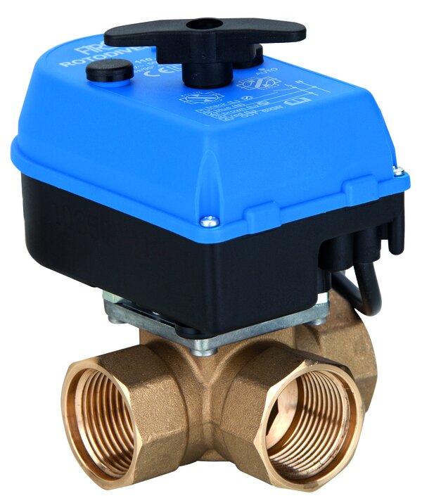 Das Dreiwegeventil ist ein Mischventil, welches über einen Eingang und zwei Ausgänge verfügt. Unser Dreiwegeventil dient dazu, zwei Volumensströme zu regeln und am Ausgang eine Durchmischung zu erreichen oder einen Volumenstrang als Vorrang zu schalten.