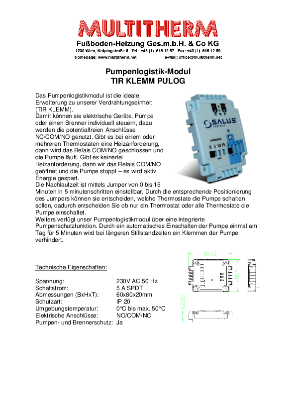 Das Pumpenlogistik-Modul (TIR KLEMM PULOG) ist ein Erweiterungsmodul zur Steuerung von Pumpen oder Boiler Logistik. Es verfügt über ein potentialfreies Relais mit einstellbarer Nachlaufzeit von 0 bis 15 Minuten welches in 5 Minuten einstellbar ist.
