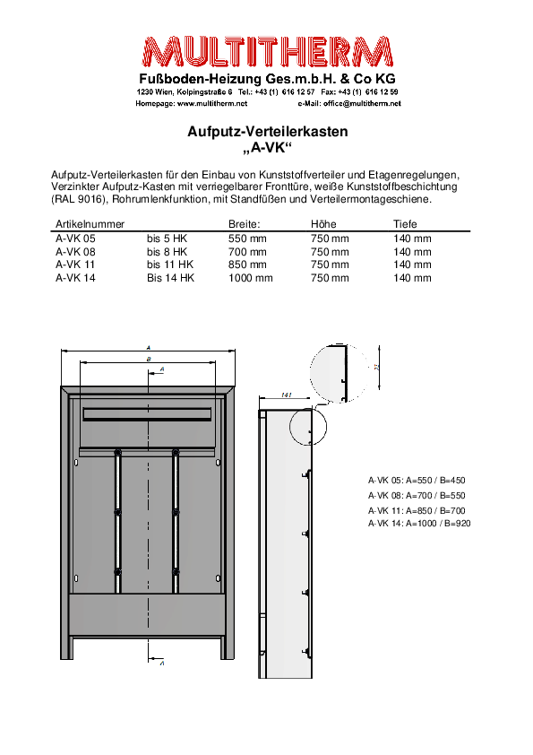 Unsere Fußbodenheizungs- Verteilerschränke dienen zur sauberen Unterbringung der Heizkreisverteiler innerhalb eines genutzten Raumes. Die Verteilerkästen gibt es für alle Verteilergrößen und sind mit einem Schloss ausgestattet. Sie eignen sich für den Einbau von Kunststoffverteiler und Etagenregelungen. Bei unserem Aufputz-Verteilerkasten handelt es sich um verzinktes Stahlblech mit einer weißen Kunststoffbeschichtung. Sie werden standardmäßig mit Standfüßen und Verteilermontageschiene ausgeliefert. Die Aufputzkästen punkten hingegen durch ihre schnelle Montage.