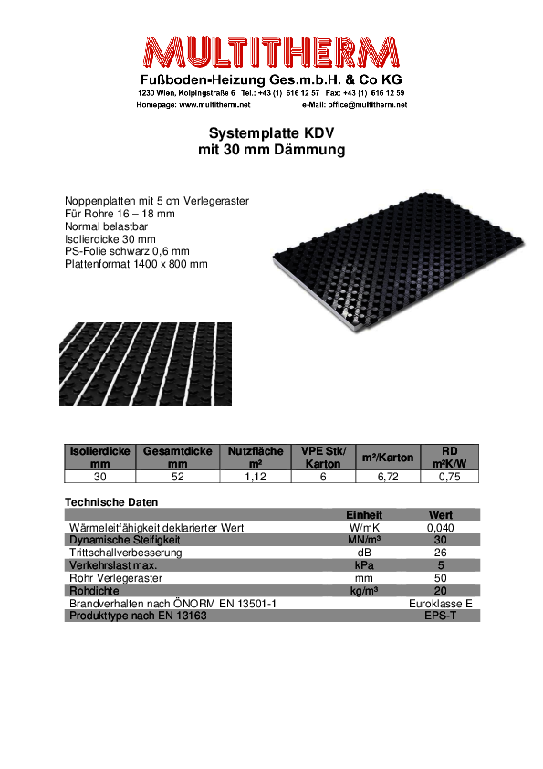 Die Noppenplatte mit 30mm Dämmung (KDV) ist eine Systemplatte mit 5 cm Verlegeraster. Sie eignet sich für Rohre mit den Dimensionen 16 – 18 mm. Unsere Noppenplatten verfügen über das einheitliche Nutzmaß von 1400 x 800 mm pro Platte, was 1,12m² entspricht. Diese Systemblatte verfügt über eine Trittschallverbesserung von 26dB mit einer gesamtdicke mit Rohrträger von 52mm.